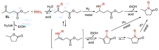 In the case of EL, the process begins with the condensation of EL and amine to the corresponding imine, which reacts with hydrogen over metal sites to form 4-aminopentanoate, and further intramolecular amidation leads to pyrrolidone. The conversion of imine can also occur via imine-enamine equilibrium, followed by the elimination of EtOH and hydrogenation to the desired product [,,,]. At the same time, hydrogenation of EL with the subsequent cyclization gives γ-valerolactone (GVL) in a side reaction (Scheme 1).