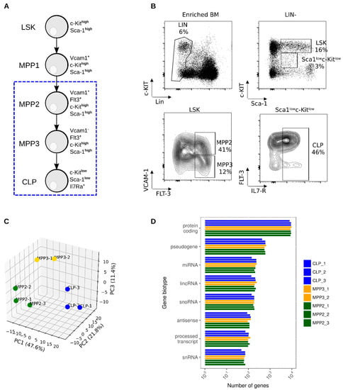 BM cells from six mice were collected by crushing femurs, tibia, hips, and spine bones and pooled. The cells were incubated with unconjugated rat antibodies against B220, Ter119, Gr1, and Mac1. Positive cells were magnetically depleted with sheep anti-rat IgG-conjugated beads and sheep anti-mouse IgG-conjugated beads (Dynabeads M-450; Dynal Thermos Fisher Scientific, Villebon, France). The remaining cells (Lin−, enriched) were labeled with fluorescent conjugated antibodies against c-Kit, Sca-1, and Lin antigenes (NK1.1, TCRβ, CD3, Mac1, CD19, GR1, and Ter119). Lin-Sca-1+c-Kit+ cells are called LSK. Anti-VCAM1 and anti-Flt3 were additionally used to isolate the MPP2 (LSK-Flt3+VCAM1+) and the MPP3 (LSK-Flt3+VCAM1−) subsets. The CLP population is characterized by the addition of anti-IL7Ralpha and their phenotype is Lin-Sca-1loc-KitloIL7Ralpha+ (Figure 1B). Cell sorting was performed on a FACS Aria III upgraded with DIVA software (BD Biosciences, San Diego, CA USA). Three independent biological replicates of MPP2, MPP3, and CLP were considered for transcriptome analysis. Pelleted cells were stored at −80 °C in QIAzol lysis reagent until RNA extraction.