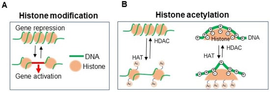 Histone acetylation targets the lysine residue of histone. DNA and histone bind to each other via a voltage charge connection, and histone acetylation reduces the positive charge in histone, resulting in a weakening of the voltage connection with DNA, leading to the activation of gene transcription. Histone acetyltransferase (HAT) accelerates histone acetylation, leading to the enhancement of gene transcription. In contrast, histone deacetylase (HDAC) suppresses the acetylation of histone and represses gene transcription (Figure 1B).