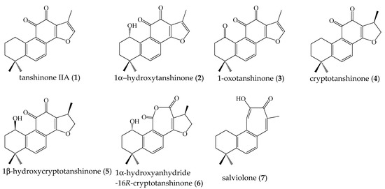 Chemical investigations have shown that S. miltiorrhiza contains a large number of diterpenes, including various tanshinone analogues, phenolic compounds (including salvianolic acids and flavonoids), along with triterpenes. Tanshinones are phenolic diterpene compounds characterized by a phenanthrenequinone core extracted from a lipid-soluble fraction of the roots [4]. More than 40 tanshinones, including ortho-quinones (i.e., tanshinone I, tanshinone IIA, dihydrotanshinone, and cryptotanshinone) and para-quinones (i.e., isotanshinone I, isotanshinone IIA, and isocryptotanshinone), have been isolated from S. miltiorrhiza roots [4,5]. Tanshinone derivatives have attracted the attention of medicinal chemists and clinicians for their anticancer properties [6,7]. Many studies have shown that tanshinones can be used to treat solid tumors and hematological malignancies, as well as to protect against cardiovascular and cerebrovascular diseases [8,9,10,11]. A structure–activity relationship between different tanshinones has also been considered [12].