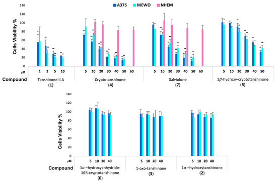 The half maximal effective concentration (EC50) able to reduce cell viability in the A375 melanoma cell line was about 1 µM for tanshinone IIA (1), 14 µM for cryptotanshinone (4), 17 µM for salviolone (7), and 42 µM for 1β-hydroxycryptotanshinone (5) (Figure 2). Instead, in the case of MeWo cell line, the EC50 useful in diminishing cell viability was 2 µM for (1), 17 µM for (4), 22 µM for (7), and 45 µM for (5) (Figure 2). For its high EC50 value, compound 5 has been considered poorly active and so its mode of action has not been further investigated. However, 1-oxotanshinone IIA (3), 1-hydroxytanshinone (2), and 1α -hydroxy-anhydride-16R cryptotanshinone (6) were found to be ineffective at least until the concentration of 40 µM (Figure 2).