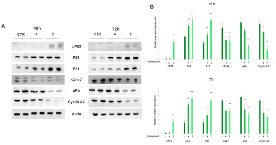 Cryptotanshinone (4) and salviolone (7) effect on the protein expression involved in cell cycle progression and pro-survival signaling. A375 melanoma cells were cultured in the presence (20 µM) or absence of salviolone (7) or cryptotanshinone (4) for 48 and 72 h. (A) Representative immunoblot showing the expression level of cell-cycle-related proteins; (B) histograms show the mean values ± SD of the protein expression level measured by densitometry deriving from three to four independent experiments. All comparisons were performed vs. each control sample after normalization with β-actin expression, * p < 0.05; ** p < 0.01.