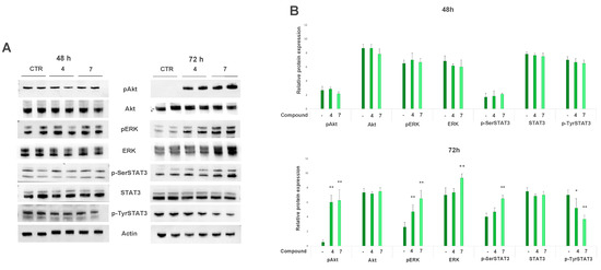 An immunoblot performed after 72-h culture in the presence of either compound 7 (20 µM) or compound 4 (20 µM) showed a significant reduction in Tyr705-STAT3 phosphorylation in comparison to untreated cells (Figure 4). Unexpectedly, the p-Ser727-STAT3 level showed an increase after 72-h treatment (Figure 4).