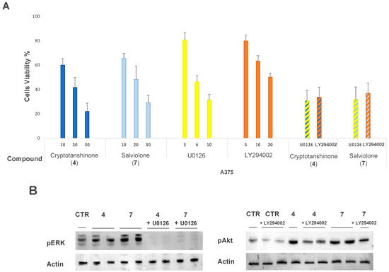 We demonstrated that salviolone (7) or cryptotanshinone (4) elicits the phosphorylation of ERK1/2 and Akt in A375 cells. Thus, we verified the effect of ERK1/2 or Akt activity on cell growth. In this regard, we blocked ERK1/2 activation using 10 µM U0126, a selective inhibitor of the ERK-upstream kinase MEK1 [33]. Moreover, we hindered Akt activation with 10 µM LY294002, an inhibitor of PI3K [34]. In addition, 72-h culture of A375 cells in the presence of U0126 or LY294002 administered alone inhibited A375 cell viability in a concentration-dependent manner (Figure 5A). However, the administration of 10 µM U0126 or LY294002 to the culture medium 2 h before either 20 µM salviolone (7) or cryptotanshinone (4) addition did not potentiate the decrease of A375 cell viability induced by the two diterpene compounds (Figure 5A). As expected, immunoblot data attested that 10 µM U0126 co-administered with either compound 4 or compound 7 at 20 µM strongly inhibited the expression level of pERK1/2 (Figure 5B). Likewise, 10 µM LY294002 co-administration with compound 7 or 4 at 20 µM induced an inhibition of the pAkt expression level (Figure 5B). Data suggest that the persistent activation of ERK1/2 and Akt, elicited by salviolone (7) or cryptotanshinone (4), does not represent a pro-survival signaling for the A375 cell line.
