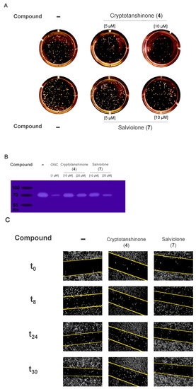 Cryptotanshinone (4) and salviolone (7) effect on colony formation, digestion of extracellular matrix, and migration. (A) A colony formation assay of A375 melanoma cells with 5 and 10 µM cryptotanshinone (4) or salviolone (7) cultured for 21 days in soft agar. (B) A gel zymography assay showing the ability of cryptotanshinone (4) or salviolone (7) to inhibit the metalloproteinase (MMP)2 gelatinase activity in A375 cells. (C) A wound healing assay attesting the inhibition of cell mobility with 20 µM cryptotanshinone (4) in the A375 cell line. Images were captured with Zeiss Axio Vert (10×) at time 0, 8, 24, and 30 h after the administration of each compound. For A, B, and C, the images reported a representative picture of three independent experiments.