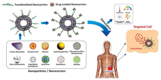 Nanocarriers can be defined as nano-scaled formulations whose size may vary from 10 to 100 nm, which encapsulate and transport various drugs in order to achieve a targeted therapy, reaching high concentrations in specifically chosen tissues, with a reduced to zero general body toxicity (Figure 1) [].
