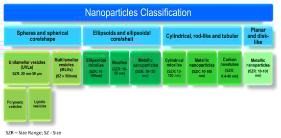 The properties of nanoparticles highly depend on their size and morphology, factors that have a significant influence on particles’ target efficiency []. According to their morphology, nanocarriers can be divided into four categories: (i) spheres and spherical core/shape-like nanoparticles; (ii) ellipsoids and ellipsoidal core/shell-like nanoparticles; (iii) cylindrical, rod-like and tubular nanoparticles; and (iv) planar and disk-like nanoparticles, which are all presented in Figure 2.