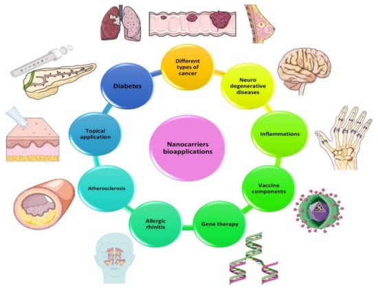 Nanocarriers’ wide range of biomedical applications makes them prone to constant evaluation and improvement at an accelerated rate over the years. Despite their primary use as carriers of anti-neoplastic drugs, there are many other applications in diseases such as diabetes, neurodegenerative diseases (Alzheimer’s disease, Parkinson’s disease, Huntington’s disease), chronic inflammations, inflammatory diseases (inflammatory bowel disease), venous thromboembolism [,], and others that are summarized in Figure 3.