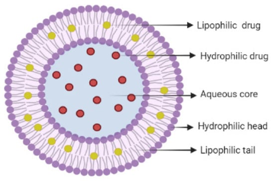 This complex structure of liposomes is stable due to the interactions between the phospholipids which are composed of a hydrophilic head and two hydrophobic tails. On account of their amphiphilic characteristics, liposomes can entrap both hydrophilic and lipophilic drugs (Figure 9) [].
