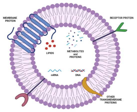 Exosomes are small-sized (30–120 nm) unilamellar vesicles that are shaped like a cup and are composed of a lipid bilayer, with a diameter of 40–100 nm, secreted by cells and that float on sucrose gradients, with a density varying from 1.13 up to 1.19 g/cm3 []. They contain a variety of proteins, nucleic acid, lipids, cytokines, and transcription factors (Figure 7). They play a role in cell-to-cell communication, participate in the regulation of physiological progress, and also in the immunologic and pathological processes of several diseases (viral diseases, cancer) []. Moreover, exosomes are secreted in all types of cells and released in body fluids (saliva, plasma, urine, and breast milk) []. Exosomes can be classified into natural and engineered exosomes, being able to deliver a variety of active compounds and are used not only for drug delivery, but also as biomarkers for early detection of cancer and treatment, and in different types of inflammations [,].