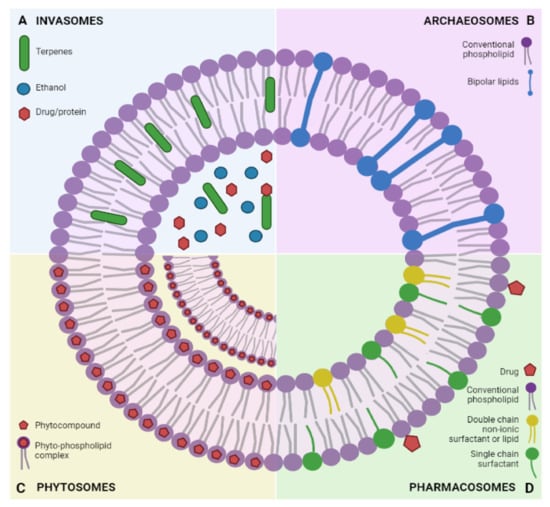 The structure and content of some types of lipidic vesicular systems: invasomes (A), archaeosomes (B), phytosomes (C), and pharmacosomes (D). Created with BioRender.com (accessed on 10 January 2022).
