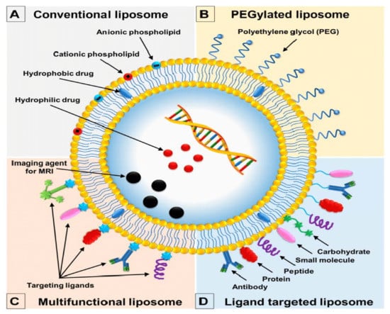 Liposomes are one of the most developed types of nanoformulations, being the vehicle of choice due to their chemical versatility, high potency, increased capacity to encapsulate a significant amount of the active compound, and due to their structural resemblance to human cells that provides the opportunity to encapsulate DNA, proteins, and antibodies [].