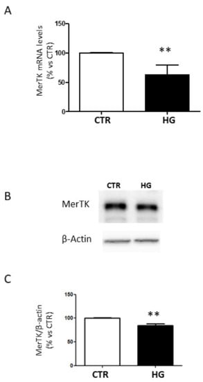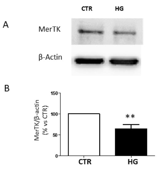 Analysis of protein expression of MerTK revealed that expression of MerTK is down-regulated after exposure to HG (Figure 1B,C).