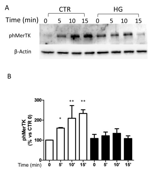 To evaluate whether HG also affects MerTK activation, cells were stimulated for 5, 10, and 15 min with 2 μg/mL Gas6, a MerTK ligand. We found that Gas6 induced hyperphosphorylation of MerTK in CTR cells, reaching its maximum after about 15 min (Figure 2). When cells were cultured with HG, Gas6 was not able to induce significant stimulation of MerTK.