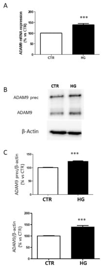 It has been reported that ADAM9 is responsible for MerTK shedding [7]. Therefore, we investigated the effects of HG on ADAM9 expression and production in ARPE-19 cells. RT-qPCR revealed that HG increased mRNA levels of ADAM9 (Figure 4A). ADAM9 is synthesized as an inactive proenzyme with a molecular weight of 100 kDa. The active enzyme (80 kDa) results from proteolytic cleavage of the prodomain [16]. Exposure of ARPE-19 cells to HG significantly increased the amount of both precursor and active form of ADAM9 (Figure 4B,C).