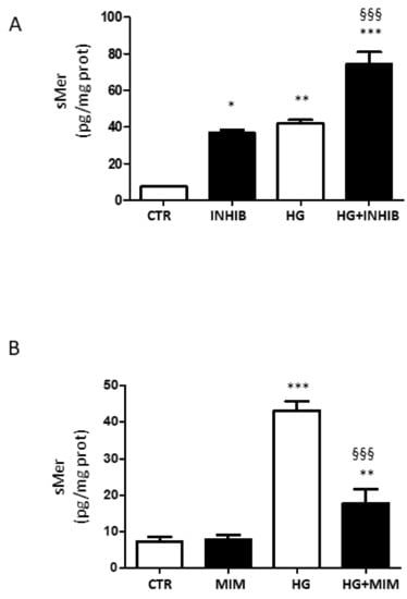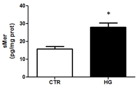The results show that sMer was almost undetectable in supernatants of ARPE-19 cells cultured under control conditions (Figure 5). The amount of sMer released in the medium significantly increased after treatment of ARPE-19 cells with HG.