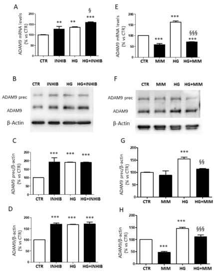 Expression of ADAM9 in ARPE-19 cells cultured for 24 h in standard medium (CTR) and in presence of high glucose (HG), silencing (INHIB), and upregulating (MIM) miR-126 under control conditions. (A,E) ADAM9 gene expression normalized vs. housekeeping genes. (B,F) Representative Western blot of ADAM9 protein expression with quantification of densitometries of both precursor (C,G) and active form (D,H). Data are expressed as mean ± SD of fold induction relative to β-actin of three independent experiments (n = 3). ** p < 0.01 and *** p < 0.001 vs. CTR; § p < 0.05 HG + INHIB vs. HG; §§ p < 0.01 and §§§ p < 0.001 HG + MIM vs. HG.