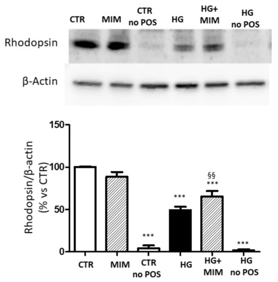 Detection of rhodopsin in ARPE-19 cells after phagocytosis assay. Cells were transfected with mir-126 mimic and then incubated with POS for 4 h. Lysates from cells labeled CTR no POS and HG no POS did not receive POS and are negative controls. (A) Representative Western blot image and (B) quantification of densitometries of rhodopsin. Data are expressed as mean ± SD of fold induction relative to β-actin of three independent experiments (n = 3). *** p < 0.01 vs. CTR; §§ p < 0.01 vs. HG.