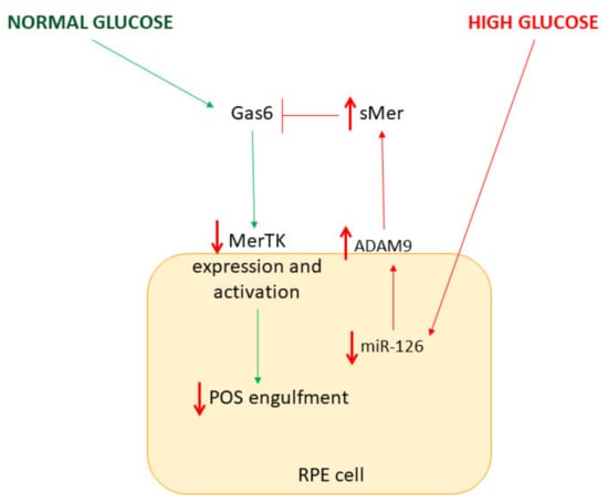 The process through which RPE cells phagocytize POS belongs to a conserved mechanism, comparable to that employed by phagocytes to remove apoptotic cells. Phagocytosis of POS is finely regulated by Mer Tyrosine Kinase (MerTK), a cell surface receptor member of the tyro/Axl/Mer family of receptor tyrosine kinase [5]. On the one hand, MerTK undergoes autophosphorylation after binding its ligands, Growth arrest-specific 6 (Gas6), or Protein S, thus activating intracellular signaling, which leads to POS engulfment [2,4,6]. On the other hand, the extracellular region of MerTK may be cleaved by Human A Disintegrin And Metalloproteases (ADAMs) and released as a soluble form (sMer) [7,8]. It has been demonstrated that sMer acts as a decoy receptor of MerTK ligands, thus inhibiting MerTK activation and, consequently, phagocytosis. Interestingly, POS phagocytosis follows a circadian rhythm in vivo, with a peak of activity 1.5–2 h after light onset that corresponds with maximum levels of MerTK phosphorylation, whereas levels of sMer increase after phagocytosis [9,10]. Law et al. showed that the presence of sMer in the extracellular space decreased POS binding to the RPE surface, whereas inhibition of MerTK cleavage increased it [9]. Therefore, the balance between the full-length and the soluble form of MerTK may represent a critical regulatory point of POS phagocytosis. Increased shedding of MerTK has been reported in macrophages exposed to high glucose (HG) [7]. Contextually, this study demonstrated that ADAM9 is responsible for MerTK shedding, and that miR-126 regulates ADAM9 expression. Specifically, HG exposure decreased miR-126 levels, with a corresponding increment in ADAM9 expression. By contrast, overexpression of miR-126 can attenuate ADAM9 expression [11].