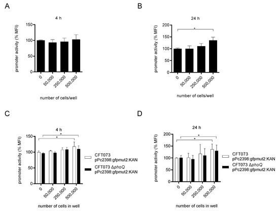 The PhoQ/P two-component system does not influence P2 induction by THP-1 cells. We co-cultured CFT073 ΔphoQ pPc2398:gfpmut:KAN (1.6 × 107 bacteria/well) in RPMI-1640 medium in the absence or presence of titrated amounts of monocytic THP-1 cells as indicated (A,B). We determined the P2 promoter activity after a culture period of 4 (A) or 24 h (B) by flow cytometry. In (C,D) we differentiated THP-1 cells with PMA (100 ng/mL) for three days. Subsequently, we co-cultured wild-type CFT073 pPc2398:gfpmut:KAN (1.6 × 107 bacteria/well) or CFT073 ΔphoQ pPc2398:gfpmut:KAN (1.6 × 107 bacteria/ well) in the absence or presence of titrated amounts of differentiated THP-1 cells for 4 (C) or 24 h (D) as indicated and determined P2 promoter activity by flow cytometry. Graphs depict three independent experiments. Each experiment was performed with three replicates. The measured promoter activity in (A–D) was normalized to the “0” control. * p < 0.05, ANOVA post-hoc Tukey.