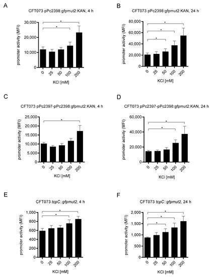 CFT073 senses potassium chloride. We cultured CFT073 pPc2398:gfpmut2:KAN (overnight culture diluted 1:6) in M9-minimal medium in the absence or presence of increasing amounts of potassium chloride for 4 (A) or 24 h (B) and determined the P2 promoter activity by flow cytometry. We repeated the experiment with CFT073 pPc2397-Pc2398:gfpmut2:KAN (overnight culture diluted 1:6) to test a possible influence of the P1 promoter on P2 (C,D) and with CFT073 tcpC::gfpmut2 to test a chromosomal reporter strain (E,F). Graphs (A,B) depict 16 independent experiments, (C,D) depict four independent experiments, and (E,F) depict three independent experiments. Each experiment was performed with three replicates. * p < 0.05, ANOVA post-hoc Tukey.