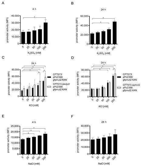 We then tested whether the two-component system KdpD/E controlling the expression of the high-affinity potassium uptake system Kpd [18,19], but also PhoQ/P, described above, influence the induction of P2 by potassium chloride. Potassium chloride induced the P2 reporter plasmid dose-dependently and significantly in both corresponding knock-out strains CFT073 ΔkdpD (Figure S2B) and CFT073 ΔphoQ (Figure S2C) as in the wild-type CFT073 strain (Figure 6C,D). We observed a statistically significant difference for P2 induction between CFT073 ΔkdpD and wild-type CFT073 at 100 and 200, and CFT073 ΔphoQ and wild-type CFT073 at 200 mM potassium chloride, respectively. Possibly, both two-component systems participate in P2 induction to a minor degree.