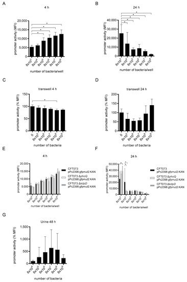 The bacterial density activates P2. We cultured CFT073 pPc2398:gfpmut:KAN in McCoy medium in the indicated amounts for 4 (A) or 24 h (B). We repeated the experiment using transwell cultures with CFT073 pPc2398:gfpmut:KAN (3.2 × 107 bacteria/well) in the absence or presence of increasing amounts of CFT073 as indicated for 4 (C) and 24 h (D). We analyzed the influence of the two-component systems KdpD/E and PhoQ/P to sense bacterial density by repeating the experiment in A and B with the strains CFT073 pPc2398:gfpmut:KAN, CFT073 ΔkdpD pPc2398:gfpmut:KAN or CFT073 ΔphoQ pPc2398:gfpmut:KAN for 4 (E) or 24 h (F). In (G) we cultured CFT073 pPc2398:gfpmut:KAN in the indicated amounts for 48 h in urine. In all experiments we determined the P2 promoter activity by flow cytometry. Graphs (A,B) depict nine independent experiments, each with one replicate, (C) depicts two independent experiments, each with two replicates, (D) depicts three independent experiments with two replicates, and (E–G) depict three independent experiments. Experiments in (E,F) were performed with one, in (G) with four replicates. The measured promoter activity in (C,D) was normalized to the “0” control. * p < 0.05, ANOVA post-hoc Tukey (A–D,G), two-way ANOVA and Dunnett’s multiple comparison test (E,F).