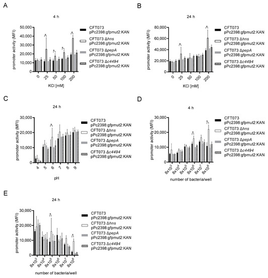 H-NS acts as negative regulator of P2. We cultured CFT073 pPc2398:gfpmut:KAN (overnight culture diluted 1:6), CFT073 Δhns pPc2398:gfpmut:KAN (overnight culture diluted 1:6), CFT073 ΔpepA pPc2398:gfpmut:KAN (overnight culture diluted 1:6), or CFT073 Δc4494 pPc2398:gfpmut:KAN (overnight culture diluted 1:6) in M9 minimal medium in the absence or presence of increasing amounts of potassium chloride for 4 (A) or 24 h (B), or increasing pH values for 24 h (C), or in McCoy medium in the indicated amounts for 4 (D) or 24 h (E). In all experiments we determined the P2 promoter activity by flow cytometry. Graphs (A,B) depict six independent experiments, (C–E) depict three independent experiments. Each experiment was performed with one replicate. * p < 0.05, ANOVA post-hoc Tukey.
