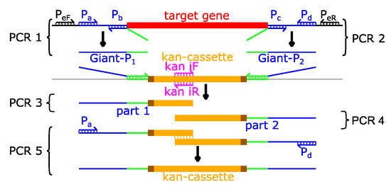 - Datsenko, K.A.; Wanner, B.L. One-step inactivation of chromosomal genes in Escherichia coli K-12 using PCR products. Proc. Natl. Acad. Sci. USA 2000, 97, 6640–6645. [Google Scholar] [CrossRef] [PubMed]