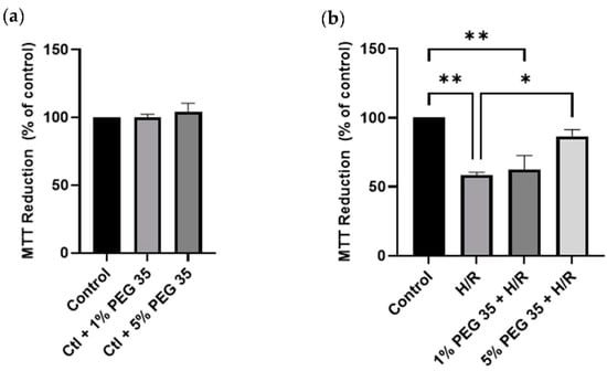 Effects of PEG35 on cell viability, in the absence (a) or presence (b) of hypoxia/reoxygenation (H/R). Cell viability rate determined via MTT assay. The values shown represent the mean ± SEM of 3 independent experiments. * p < 0.05; ** p < 0.01.