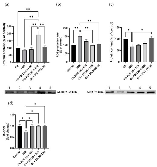 PEG35 has been tightly linked to the mitochondrial enzyme ALDH2 when working against ischemia reperfusion injury in several studies [,]. Thus, we examined whether PEG35 treatment could increase ALDH2 levels. While in the control, hypoxia/reoxygenation and 1% PEG35 groups, the protein levels were similar, in the 5% PEG35 group there was a significant increase in ALDH2 content (Figure 2a). As ALDH2 is a key enzyme that functions against oxidative stress, we then investigate if its increased levels could reduce oxidative stress. As expected, compared to the control, hypoxia/reoxygenation significantly increased ROS production (Figure 2b). Moreover, in accordance with the increased ALDH2 content, the 5% PEG35 preconditioning significantly prevented the increase in ROS levels found in the hypoxia/reoxygenation group. In addition, we also evaluated the protein levels of one of the master regulators of antioxidant defense and a regulator of the expression of the mitochondrial antioxidant protein, nuclear factor-E2-related factor 2 (Nrf2) and manganese-dependent superoxide dismutase (MnSOD), respectively. The results revealed that hypoxia/reoxygenation treatment inhibited the expression of Nrf2, while the 5% PEG35 preconditioning seemed to reverse this tendency, but not in a significant way (Figure 2c). The expression of the MnSOD gene was decreased in the hypoxia/reoxygenation group, but it was recovered to control levels in the PEG35-treated groups (Figure 2d).