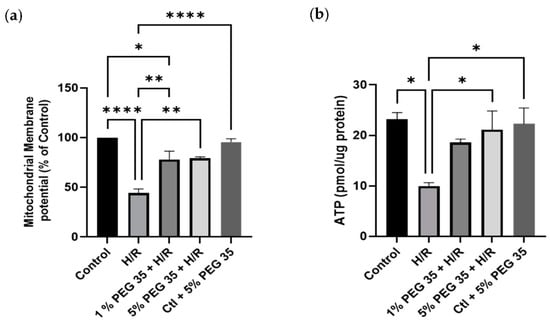 PEG35 effects on mitochondrial function. (a) Mitochondrial membrane potential (ΔΨ) was assessed using TMRM, as described in the Materials and Methods section. (b) ATP content in HepG2 cells. The values shown represent the mean ± SEM of 3 independent experiments. * p < 0.05; ** p < 0.01; **** p < 0.0001.