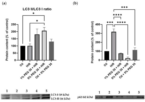 Autophagy-related protein markers in HepG2 cells. (a) Representative Western blot for LC3 I and LC3 II and respective LC3II/LC3I ratio quantification. (b) Representative Western blot for p62 and respective quantification for: 1-Ctl; 2-H/R; 3–1% PEG35 + H/R; 4–5% PEG35 + H/R; 5-Ctl + 5% PEG35. The values shown represent the mean ± SEM of 3 independent experiments. * p < 0.05; *** p < 0.001; **** p < 0.0001.