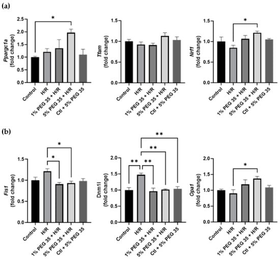 Mitochondria are highly dynamic organelles regulated by fission and fusion events. As can be seen in Figure 5b, hypoxia/reoxygenation leads to the upregulation of genes coding for the mitochondrial fission 1 protein (Fis1) and dynamin-related protein 1 (Drp1) (fis1 and dnm1l, respectively), both mitochondrial fission-related genes. Both PEG35 concentrations were able to attenuate this increased gene expression to control levels. In addition, 5% PEG35 preconditioning significantly upregulated the expression of the gene coding for optic atrophy 1 protein (opa1), a key mediator in mitochondrial fusion.