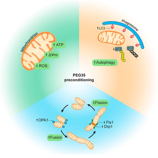 Schematic representation of PEG35-mediated protection following hypoxia/reoxygenation injury. PEG35 preconditioning alleviates mitochondrial dysfunction, including the recovery of mitochondrial membrane potential and ATP levels and the reduction of ROS production. In addition, PEG35 treatment suggests enhanced autophagy and a modulation of mitochondrial biogenesis via increased mitochondrial fusion and decreased mitochondrial fission following hypoxia/reoxygenation injury.
