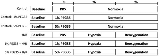 A schematic representation of the experimental protocol. HepG2 cells were randomly divided into the following groups: control, control treated with either 1% PEG35 (Ctl + 1% PEG35) or 5% PEG35 (Ctl + 5% PEG35), 2 h of hypoxia followed by 2 h of reoxygenation (H/R) and preconditioning with 1% PEG35 or 5% PEG35 prior to H/R, 1% PEG35 + H/R and 5% PEG35 + H/R, respectively.