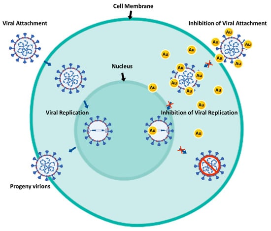Representative mechanism of the antiviral properties of Au-NPs. On the left, a normal mechanism by which a virus infects a host cell (in this case, a eukaryotic cell) can be seen: firstly, viral attachment to the cell membrane occurs, followed by penetration into the cytoplasm; then the virus proceeds to use the cellular mechanisms to replicate its genetical material, generating virions to continue the infectious cycle. On the right, is shown a mechanism of inhibition by which Au-NPs can intervene, either by attaching themselves to the virus, blocking its attachment to the cell and consequent entry in the cell and ultimately interfering with the mechanisms of viral replication inside the cell (adapted from []).
