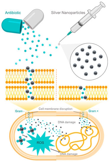 Metallic particles could work with standard drugs to increase their antimicrobial activity. Moreover, the majority of practical trials in the literature regarding the synergistic effect between metals and drugs use Ag-NPs combined with antibiotics. Figure 2 presents an example of the combined action of antibiotics with Ag-NPs. M-NPs can disrupt the bacterial membrane of both Gram-negative (left) and Gram-positive (right) bacteria, enabling the entrance of antibiotics into the cell and leading to DNA damage. Moreover, the combined action of antibiotics with M-NPs induces oxidative stress and creates ROS; consequently, it also damages the bacterial DNA (as noted above) [,,,,,].
