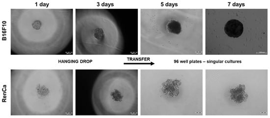 As in B16F10, seeding density does not have a high influence on spheroid shape (data not shown), in the RenCa model, low or to high number of cells affected cell viability or shape, respectively (Supplementary Figure S1). In order to obtain regular spheroids with a diameter higher or equal to 400 µM, the seeding density was optimized to 500 of cells/drop and a cultivation time of up to 7 days for both cell lines. After three days of culture, irregular aggregates were observed, and regular spheroids were observed after seven days of cultures in both cell lines (Figure 1).