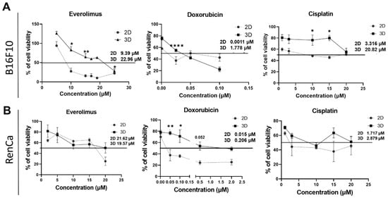 Sensitivity of cells in 2D and 3D culture. (A)—sensitivity to everolimus, doxorubicin, and cisplatin of B16F10 cell line in 2D and 3D culture conditions as assessed by the use of the alamarBlue method. (B)—sensitivity to everolimus, doxorubicin, and cisplatin of RenCa cell lines in 2D and 3D cultures assessed using alamarBlue method. Statistical analysis was performed by One-Way ANOVA/Tukey test or Kruskal–Wallis/Dunn’s test—* p < 0.05, ** p < 0.0021, **** p < 0.0001, N ≥ 3 (2D—control).