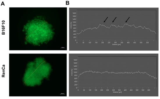 As a higher resistance to all tested drugs was observed in 3D melanoma cultures than in 2D, we assessed whether these differences result from the conditions applied by its spheroidic architecture altering the drug distribution. Doxorubicin is a fluorescent molecule (0.001 µM), its distribution was thus estimated (Figure 3A,B), by assessing fluorescence intensity at different points in the spheres after incubation of the spheres with drug for 48 h. In the renal model, no significant change was observed as the fluorescent signal was homogenous throughout the sphere. In the melanoma model, several peaks were distinguishable along the fluorescence signal histogram, indicating drug accumulation. The drug penetrated the whole mass of the 3D structure, including its core (Figure 3A,B).