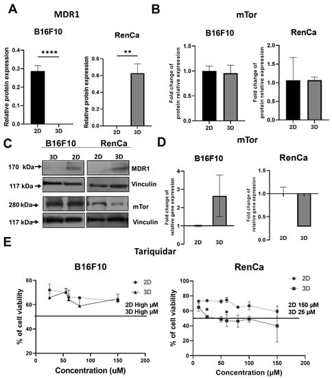 Drug resistance is often due to MDR1, a glycoprotein which is widely expressed in cancer cells, ensuring exportation of the drugs out of the cells []. We assessed if differences in the sensitivity to drugs might be related to MDR1 expression. In the B16F10 model, the MDR1 protein bands were visible only for 2D cultures, while no expression of MDR1 was detected in 3D culture lysates. Oppositely, in the RenCa model, no MDR1 protein was detected in 2D, but it was induced by spheroid culture (Figure 4A,C). To assess for the role of MDR1 for cell viability, we assessed the cell sensitivity to Tariquidar which is an MDR1 inhibitor []. Viability of B16F10 cells in both culture conditions was not affected; both in MDR1-expressing 2D and MDR1-negative 3D cells (Figure 4E). In the case of the renal cancer cells model, the 3D cultures were more sensitive to Tariquidar than 2D cultures (Figure 4E)—the IC50 levels for 3D was 25 µM, while for 2D, the IC50 was 150 µM. These results were confirmed by staining drug treated cells with propidium iodide. More dead RenCa cells were observed after exposure to Tariquidar in 3D culture models (Supplementary Figure S2). The mammalian target of rapamycin (mTor) is an important regulator of proliferation, differentiation, apoptosis, and tumorigenesis []. mTor is very strongly associated with tumor malignancy in melanoma and renal cancer [,]. Consequently, we assessed if the modulation of mTor protein and its gene expression in 2D and 3D cultures for both cancer models might explain the differences in the response to everolimus. In the melanoma model, no significant change for both protein and gene expression was observed between the culture conditions (Figure 4B–D). In the renal cancer model, a downregulation of gene expression was observed in 3D cultures, but this effect was not maintained at the level of protein (Figure 4B–D).