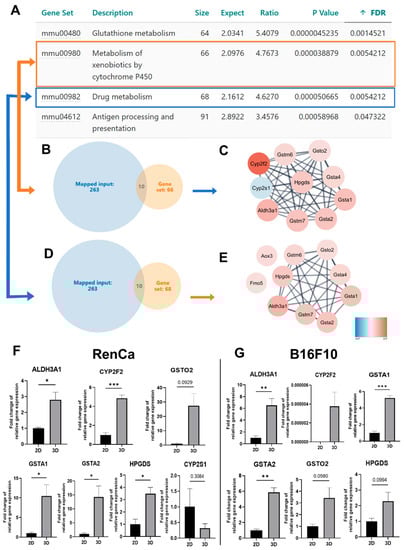Modulation of drug related genes by 3D cultures. (A)—Enrichment analysis based on Gene Ontology pathway shows the top 4 activated processes in both cell types (web-based gene set analysis toolkit enrichment method: ORA; organism: mus musculus). (B)—screening of genes related with metabolism of xenobiotics. (D)—screening of genes related with metabolism of drugs. (C,E)—Functional enrichment protein network performed in Cytoscape software (v.3.8.0). (F)—The gene expression of Cyp2s1, Cyp2f2, Gstm6, Gsto2, Gsta4, Hpgds, Gsta1, Gsta2, Gstm7, Aldh31a for RenCa cells was determined by quantitative RT-PCR (qRT-PCR); β-actin served as a quantitative internal control. (G)—The gene expression of Cyp2s1, Cyp2f2, Gstm6, Gsto2, Gsta4, Hpgds, Gsta1, Gsta2, Gstm7, Aldh31a for B16F10 cells was determined by quantitative RT-PCR (qRT-PCR); β-actin served as a quantitative internal control. Statistical analysis was performed by One-Way ANOVA/Tukey test or Kruskal–Wallis/ Dunn’s test—* p < 0.05, ** p < 0.0021, *** p < 0.0002, N ≥ 3 (2D—control).