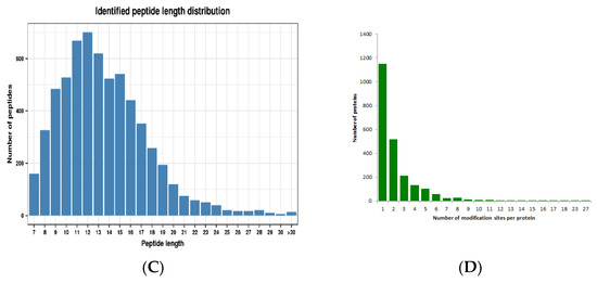Lysine crotonylation (Kcr) is an evolution-conserved histone posttranslational modification (PTM) [21]. However, its regulatory role is poorly studied in the woody plant paper mulberry. To achieve an overview of lysine crotonylation in paper mulberry, we conducted systematic and qualitative crotonylated profiling in young leaf tissues of paper mulberry through four steps: protein extraction, trypsin affinity enrichment, LC–MS and bioinformatics analyses (Figure 1A). A total of 6600 peptides and 5158 crotonylated peptides were identified by spectrogram analysis. A total of 5195 crotonylation sites were identified on 2272 proteins (Figure 1B and Supplementary Table S1). A previous report identified 971 crotonylated proteins from the woody plant Camellia sinensis [22], however, in the current study, the number of lysine crotonylation sites was twice as many and the number of crotonylated proteins was twice as many as previously reported. The mass errors for those crotonyl peptides were near 0, with the majority less than 5 ppm, implying a high level of accuracy of the data. The length of most of the identified crotonylpeptides ranged from 7–22 amino acids with a few longer exceptions, even more than 30 amino acids (AAs) (Figure 1C). Over 50% of the crotonylpeptides carried only 1 crotonylsite; approximately 23% of the crotonylpeptides covered 2 crotonylsites; approximately 10% crotonylpeptides covered 3 crotonylsites, and approximately 10% of the remaining crotonylpeptides had more than three crotonylsites (Figure 1D). The abundance of lysine crotonylation in other plant samples was reviewed (Table 1), which may explain the significant differences in protein crotonylation levels between species. In addition, we speculate that the current study identified more acetylated peptides than previous studies, due in large part to improved antibody efficiency and mass spectrometry sensitivity.