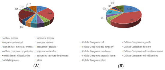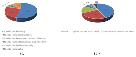 The GO functional classification of all the acetylproteins was investigated in terms of biological process, cellular component and molecular function. The results of biological process analysis showed that most of the crotonylated proteins were involved in the metabolic process (25%), response to stimulus (19%) and cellular process (13%) (Figure 3A), which accounted for over half of the identified crotonylated proteins, indicating a primary role of lysine crotonylation in metabolism. It is also worth noting that response to stimulus accounted for 19%, mainly including response to abiotic stimulus, response to endogenous stimulus and response to external stimulus. This may also be the reason why the paper mulberry can grow well under the environmental conditions of karst lime soil. For the “molecular function” category, most crotonylated proteins were found to be related to binding (54%) and catalytic activity (26%) in the molecular function classification (Figure 3B), suggesting that massive crotonylated proteins are involved in DNA transcription or protein interaction. Consistent with these findings, most crotonylated proteins were found to be associated with organelles, cells and membranes in the cellular component classification, accounting for 40%, 21% and 10% of all the identified proteins, respectively (Figure 3C). A large proportion of the identified crotonylated proteins in paper mulberry leaves were located in the chloroplast (43%), cytoplasm (24%) and nucleus (16%) (Figure 3D) and were shown in subcellular localization analysis, is consistent with previous research results [24], suggested that chloroplast metabolism-related enzymes may be the target and substrate of lysine crotonylation. Eukaryotes have long been thought to have arisen by evolving a nucleus, endomembrane and cytoskeleton [25].