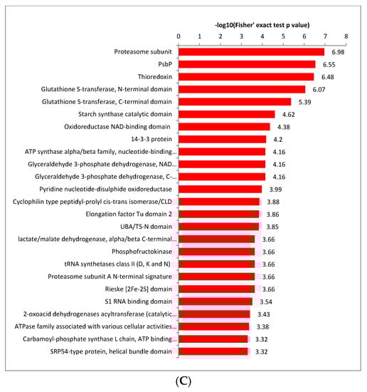 Enriched protein domain analysis showed the proteasome subunit, PsbP, thioredoxin, glutathione S-transferase, N-terminal domain, glutathione S-transferase, C-terminal domain, glutathione S-transferase, C-terminal domain, starch synthase catalytic domain, oxidoreductase NAD-binding domain, ATP synthase alpha/beta family, nucleotide-binding domain, etc. were enriched for crotonylated protein domain enrichment (Figure 4C and Supplementary Table S5). The crotonallin/26S proteasome pathway has been implicated in diverse aspects of eukaryotic cell regulation through its ability to rapidly remove intracellular proteins. Thioredoxins are ubiquitous disulfide reductases that regulate the redox status of target proteins. Plant thioredoxins display striking diversity not found in other organisms [27], suggesting that proteins related to enzyme metabolism may be largely crotonylated in paper mulberry. ATP synthase is an essential component of the photosynthetic apparatus in chloroplasts and is one of the major protein complexes of the thylakoid membrane [28].