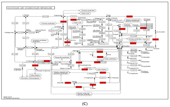 (A) Crotonylated proteins involved in photosynthesis. The identified crotonylated proteins are highlighted in red. (B) Crotonylated proteins involved in carbon fixation in photosynthetic organisms. The identified crotonylated proteins are highlighted in red. (C) Crotonylated proteins involved in glyoxylate and dicarboxylate metabolism. The identified crotonylated proteins are highlighted in red.