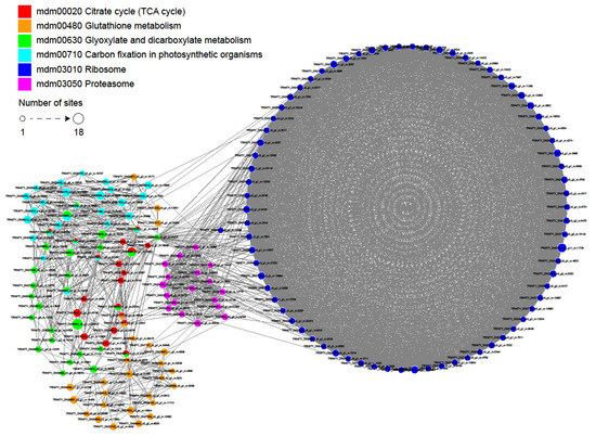 Function prediction based on the protein interaction network has become a hot spot in protein function analysis and prediction, which can integrate various data information and has the advantage of measuring and predicting protein functions accurately at an overall level [32]. To further investigate the role of crotonylation in cell regulation, we used algorithms from Cytoscape software [33] to establish a protein interaction network (Figure 6 and Supplementary Table S6). A total of 1569 crotonylation sites were identified as nodes in the Protein Interaction database, revealing a global view of the diverse cellular functions of crotonylated proteins in paper mulberry. Based on the Cytoscape algorithm, 30 clusters of crotonylated proteins were retrieved from the complicated interaction network. As shown in Figure 6, six highly interconnected clusters of crotonylated proteins were involved in citrate cycle, glutathione metabolism, glyoxylate and dicarboxylate metabolism, carbon fixation in photosynthetic organisms and ribosomes and proteasomes The results of the protein interaction network analysis demonstrated the involvement of crotonylation in the regulation of critical biological processes.