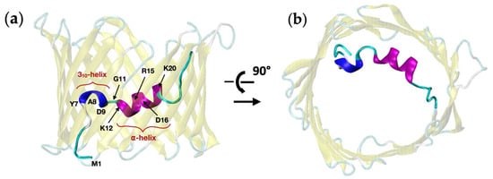 Structure of mVDAC1 solved by crystallography (PDB ID: 3EMN, adapted from Ref. [18], 2.3 Å-resolution) attributed to the open state of the channel. Key residues and major structural components of the N-terminus (residues M1 to G25), including the 310- and alpha helices, are shown. (a) Side view (MOM), (b) top view.