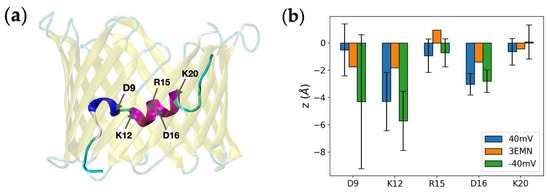 To get a better understanding of the impact of the voltage on the changes observed in the N-terminal backbone, we have recorded the position of N-terminal charged residues, namely, D9, K12, R15, D16 and K20, over the course of aMD simulations. Average positions of Cα atoms along z, i.e., the direction of the field, are shown in Figure 3. As a comparison, the z-coordinate of these atoms was also provided for the 3EMN structure. Although standard deviations were found to be significant for several residues (which was expected due to the disordered state of the N-terminus), residues D9 and K20 seemed more sensitive to the voltage orientation than other charged residues. More precisely, D9, a negatively-charged residue, showed a certain tendency to move upward at +40 mV and downward at −40 mV, with respect to the crystal structure. Similar sensitivity was observed for K20, a positively-charged residue, moving in the opposite direction as D9. Conversely, we realized that the average positions of residues K12, R15 and D16 were much lower at both +40 mV and −40 mV than in the crystal structure, which indicated that the most probable positional change of the long α-helix was to shift down along the barrel, irrespective of the voltage value. Importantly, the apparent charge of the N-terminal tail M1-G11 was −1.69 at neutral pH and at 150-mM KCl concentration (−1.15 for the N-terminal “tip” M1-P5), whereas the apparent charge of the K12-T19 segment was +0.07 in the same conditions, which is consistent with the present results showing that the N-terminal tail is more influenced by the voltage, as compared with the K12-T19 helix.